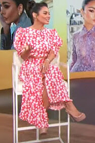 Vanessa Hudgens slays Miu Miu Marocain Floral-Print Blouse for Access Hollywood interview