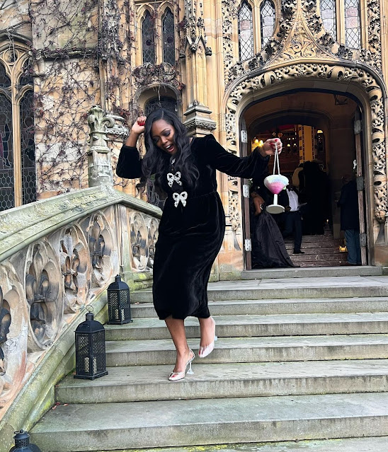 Beth models boss Elizabeth Elohor slays in black SALONI Camille Jumpsuit with pearl bows ✨🎀✨velvet dress bag @judithleiberny Dress @saloniofficial Shoes @aminamuaddi @thepoloavenue for @ritaudominic @fidelisanosike Yorkshire wedding
