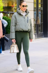 Jennifer Lopez wearing Aimn Sage Sense Tights, On Cloudtilt x Loewe Sneakers, Gucci Horsebit Square Sunglasses in Grey, Jennifer Fisher 2 Thread Hoop Earrings and Hermes Himalayan Croc Birkin Bag
